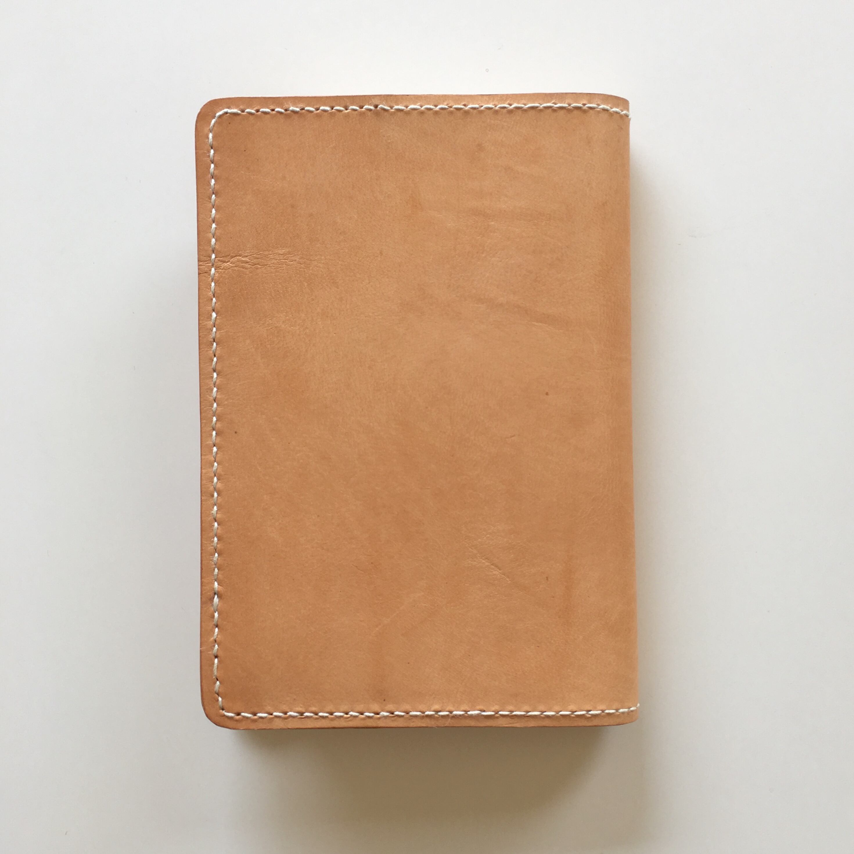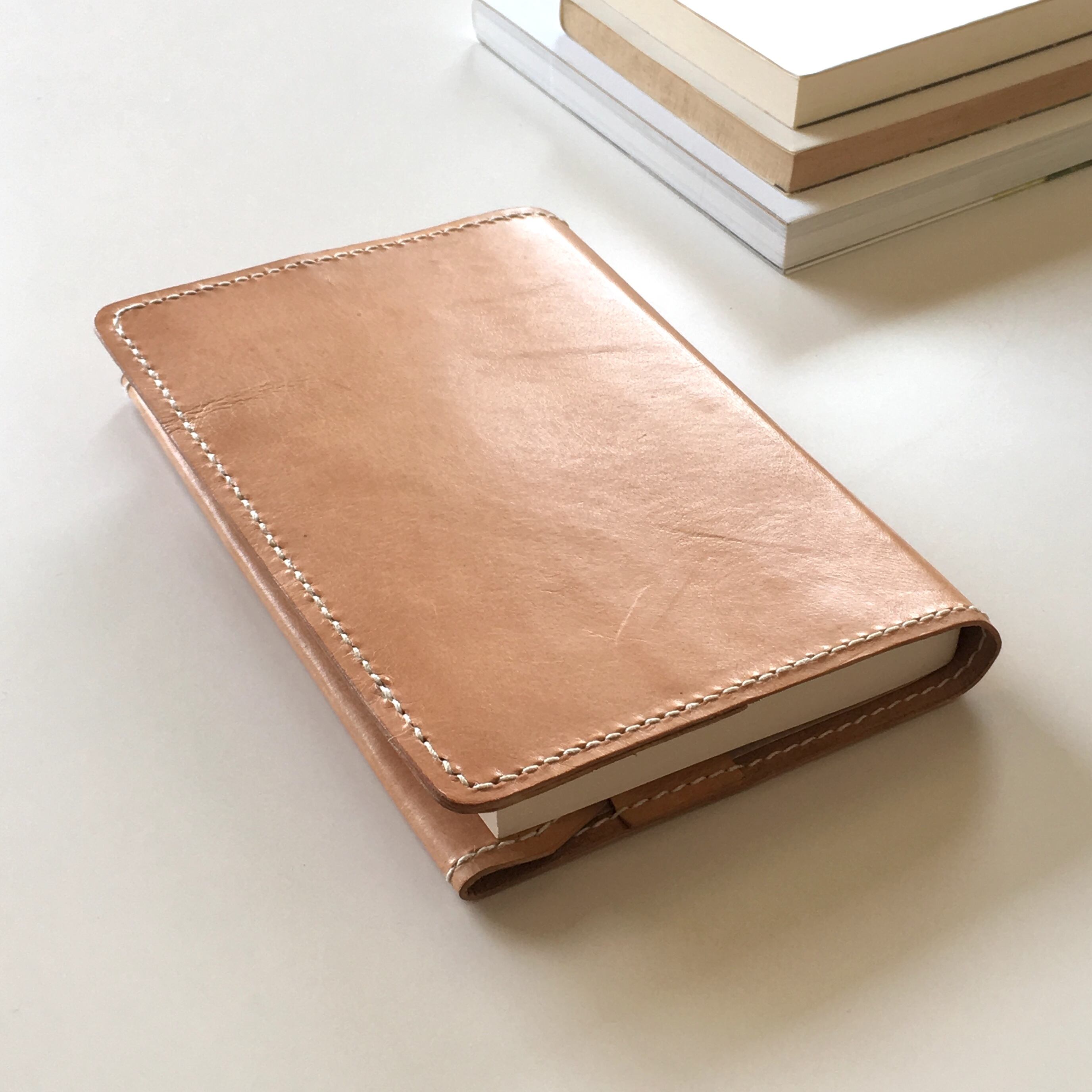 バッファローカーフ(水牛の仔牛革)で一針一針手間と思いを込めながら、ブックカバーを制作いたしました。