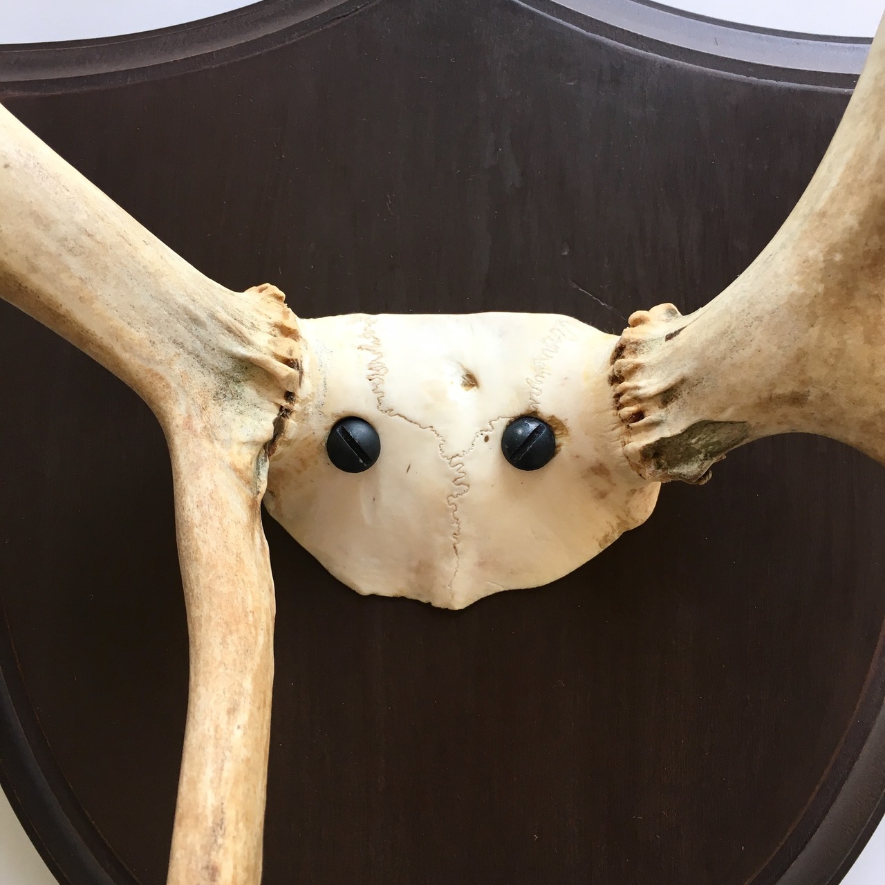 それほど大きなサイズではないので、大きな物は掛けられないという方や、頭骨が完全に付いたままのスタイルに抵抗がある方も、抵抗なく飾る事ができると思います。