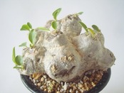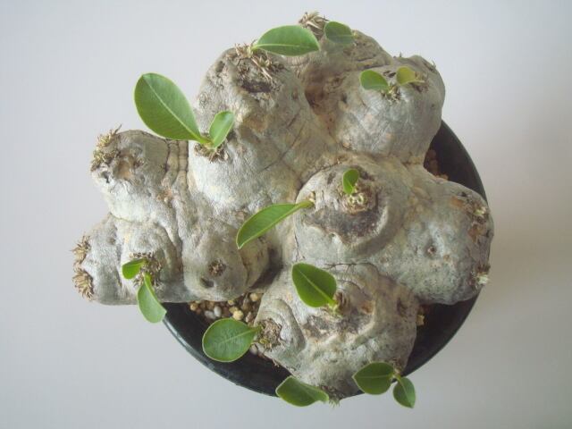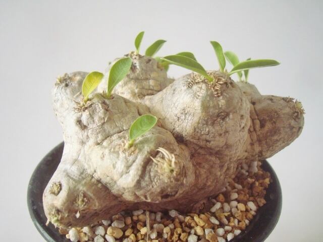 岩から葉っぱが直接生えているような変わったスタイルで、個性的なパキポディウムの中でも、特に目を惹きます。