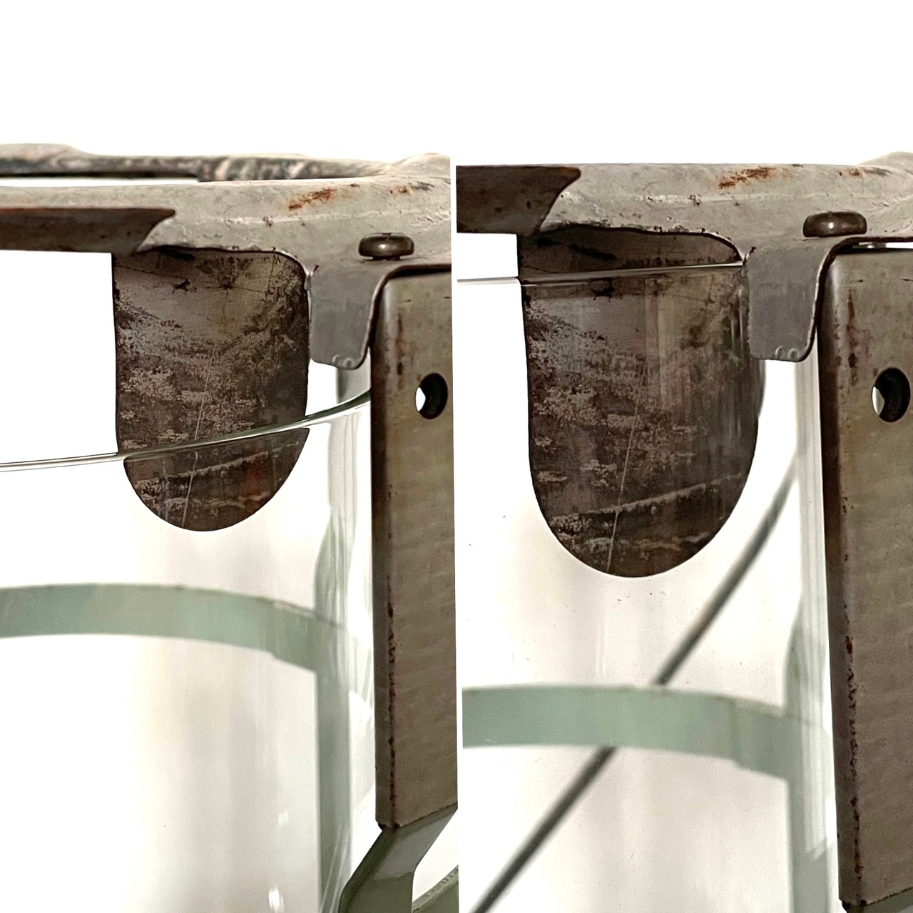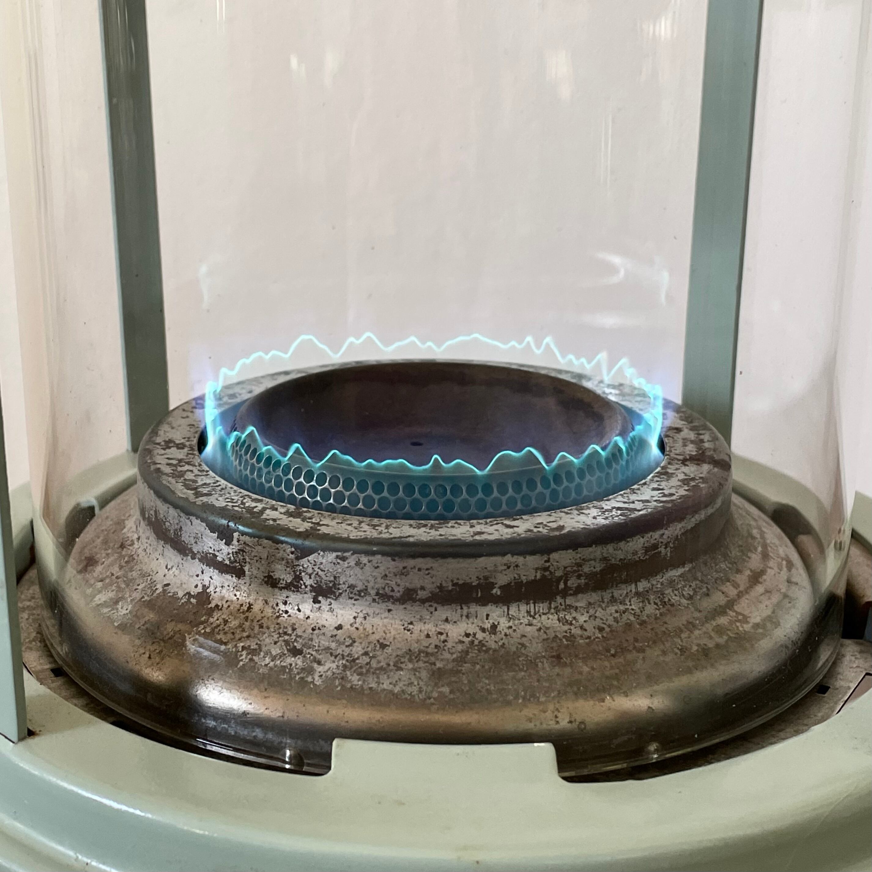 画像6枚の左側がオリジナルのチムニーと同じ長さのガラスチムニーで、右側が装着している改良型のガラスチムニーです。長さの違いがお分かりいただけると思います。