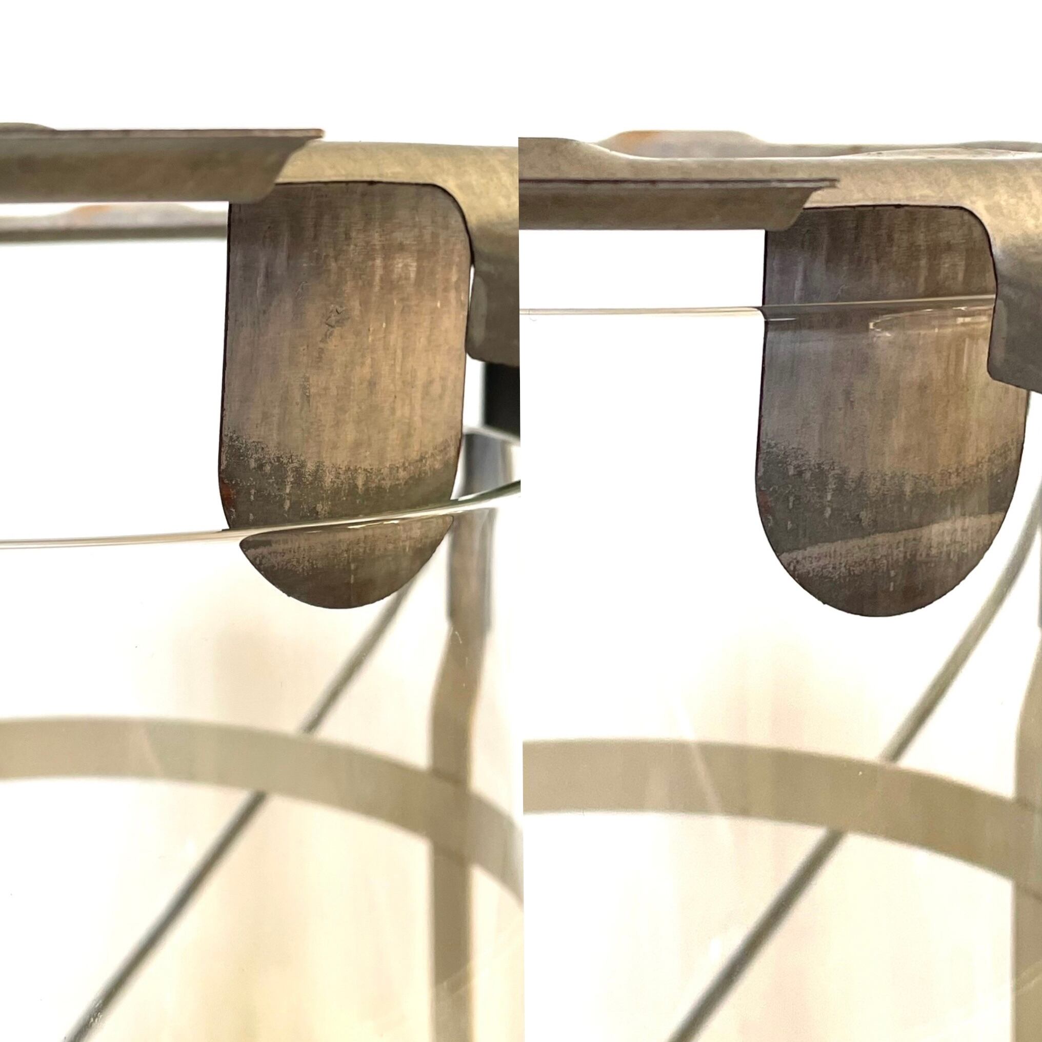 画像5枚の左側がオリジナルのチムニーと同じ長さのガラスチムニーで、右側が装着している改良型のガラスチムニーです。長さの違いがお分かりいただけると思います。6枚目画像のように、横から見た時にガラスが一体化しているように見える用にも工夫した長さにしてあります。